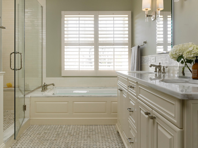 Featuring benjamin moore's moonshine pale gray shade, this spacious bathroom by soucie horner uses layers of white and gray to keep the decor classic, timeless, and traditional. See more ideas about beautiful bathrooms, bathroom design, bathroom inspiration. The floor is elegant and has just enough pattern to be visually interesting; Traditional bathroom designs generally take inspiration from design trends, materials and decor connected to specific historical eras. Warm color schemes with shades of tan, beige, and white are a good way to make a traditional style feel inviting in the primary bathroom.